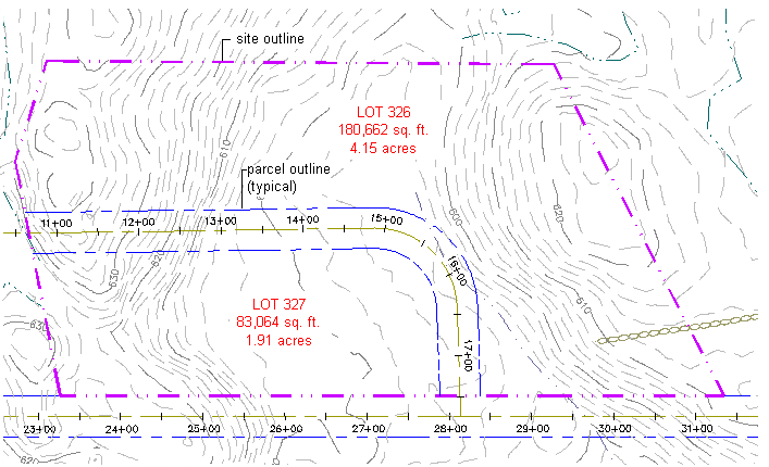 Parcels in a collection can be either unattached or touching, but they cannot overlap. If you attempt to overlap two parcels, the region of overlap defines a third parcel. Similarly, if an alignment crosses a parcel, it divides the parcel into two parcels. In the following illustration, before adding the alignment, the site was all one parcel: