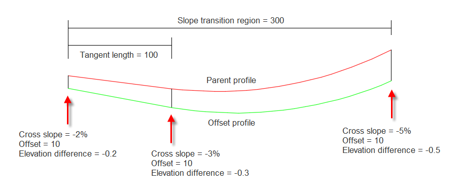 Where there is a transition region specified between one cross slope to another cross slope, the offset profile geometry is created as shown in the following example.