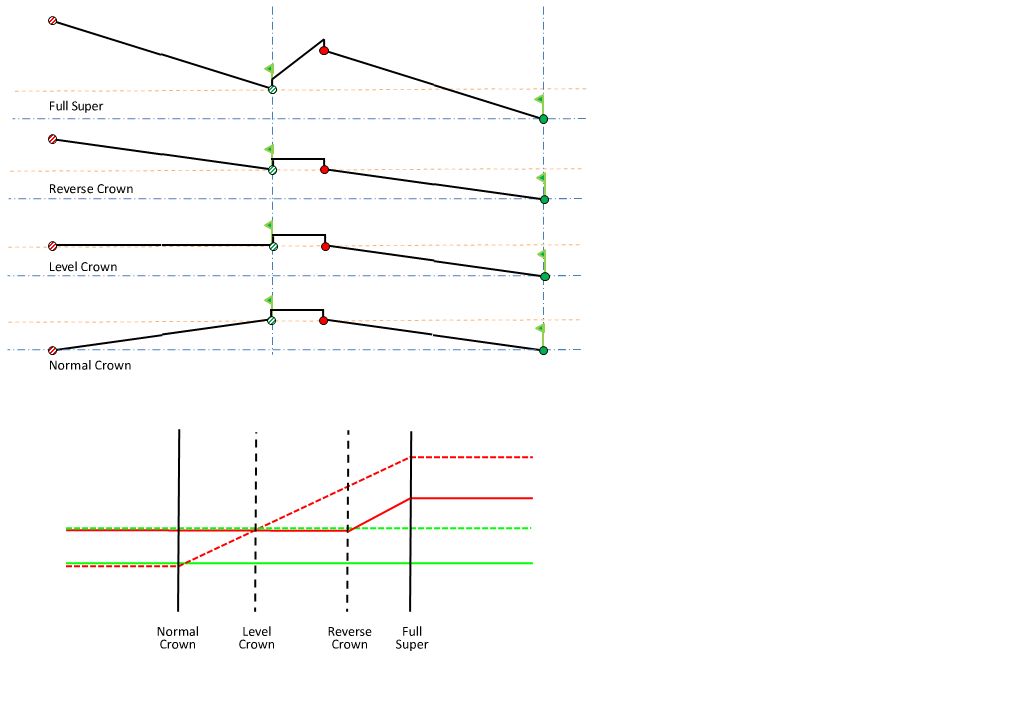 For an explanation of superelevation diagrams, see About Superelevation Axis of Rotation Pivot Methods.