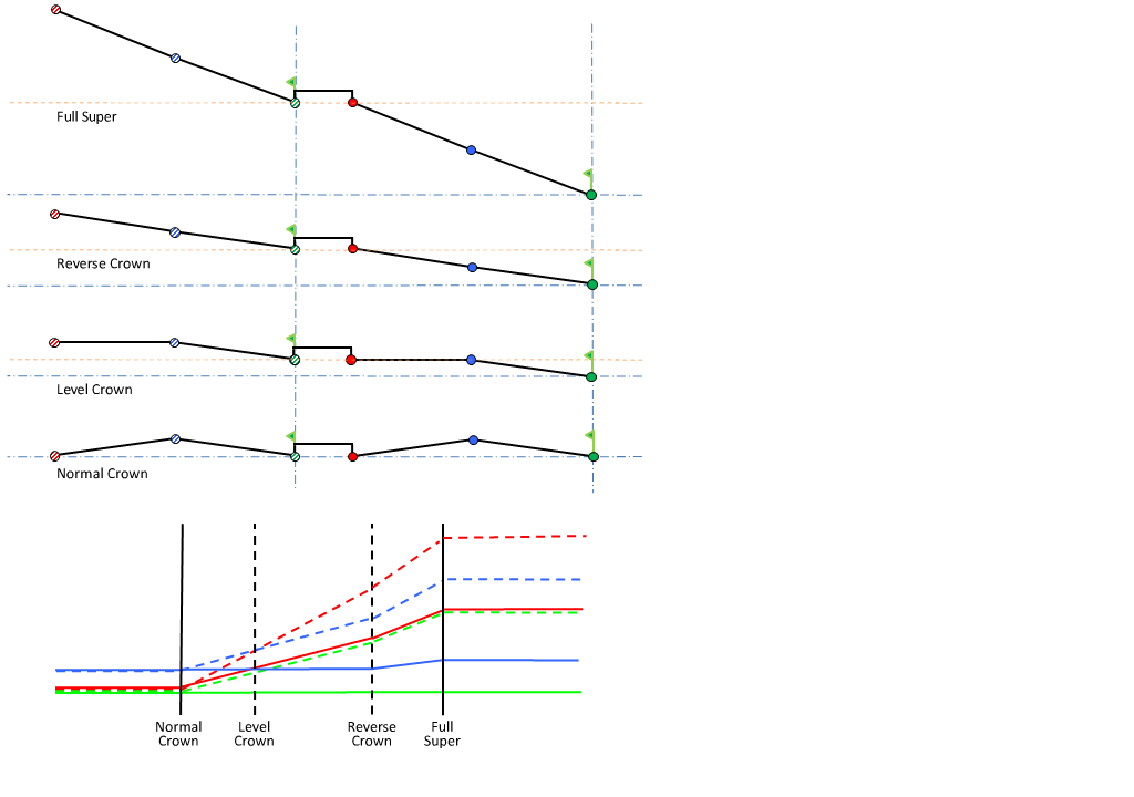 For an explanation of superelevation diagrams, see About Superelevation Axis of Rotation Pivot Methods.