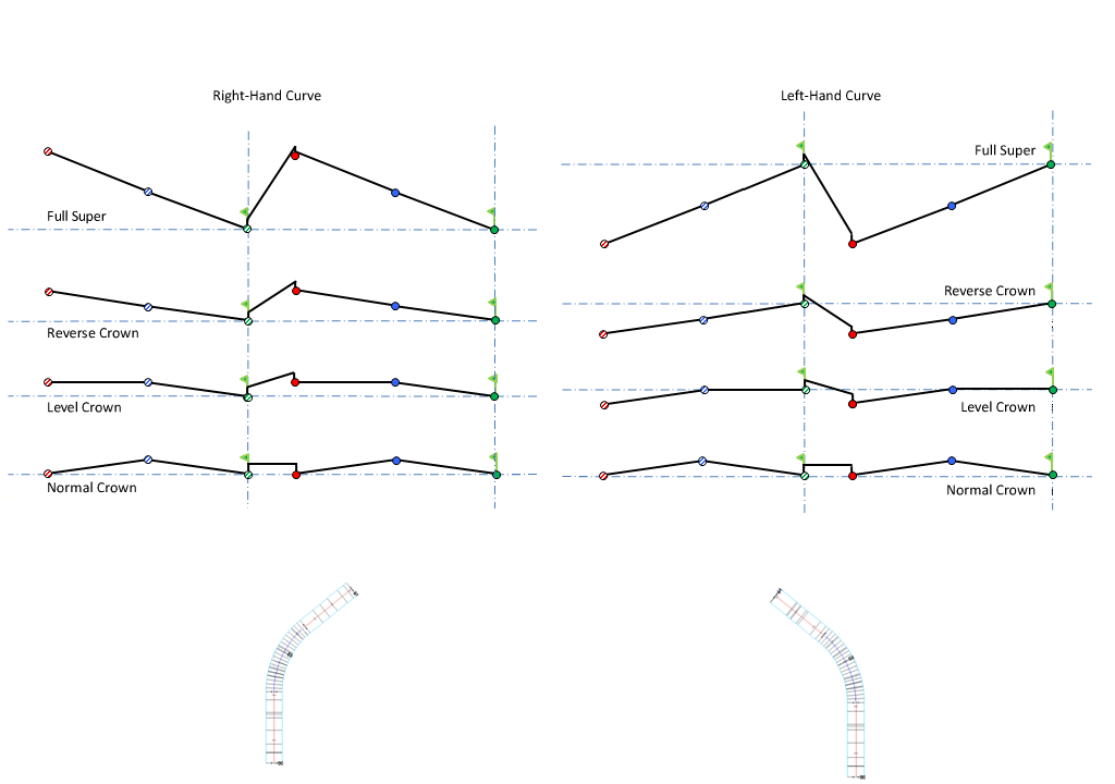 For an explanation of superelevation diagrams, see About Superelevation Axis of Rotation Pivot Methods.