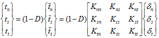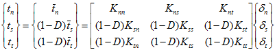 The stiffness components (Kij) that appear in the traction/separation constitutive relations are assumed to be functions of the damage variable D. For simplicity sake, we will adopt the following linear form of the damaged constitutive relations.