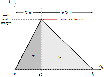 The damage evolution model must be capable of accurately expressing the evolution of the damage variable D from its initial value of 0 to its final value of 1 regardless of the exact history of combined loading sustained by the cohesive material. Note, it is possible to develop a damage evolution model expressed in terms of strains (i.e., relative displacements) or stresses, but for our initial implementation, we adopt a strain-based (relative displacement) approach. It is logical and perhaps intuitive to hypothesize that damage evolution is affected differently by normal and shearing relative displacements. However, for the sake of simplicity, we assume that damage evolution can be expressed as a function of a single scalar measure of relative displacement (referred to as the effective relative displacement