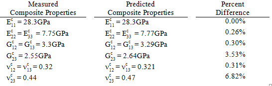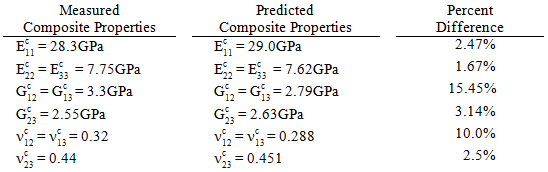 If the micro-mechanical finite element model is used in conjunction with the measured bulk constituent properties, the following composite properties are predicted: