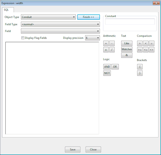 This dialog is used to build SQL expressions for use in displaying Themes or Labels in the GeoPlan Window.