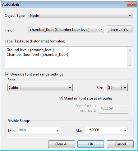This dialog is used to customise the text displayed by auto labels on the GeoPlan View.