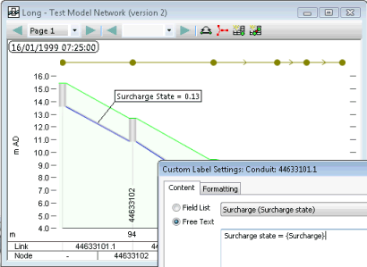 Example in InfoWorks ICM of a Long Section Window with an object database field name specified as free text
