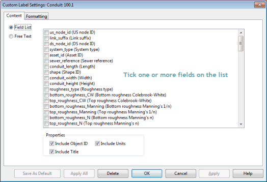 Entering an object results field name within curly brackets (e.g. Minimum Pressure = {pressure}), will display the results value of that field when the label is attached to an appropriate network object.