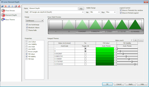 The most valid range settings for your previous selections are selected by default. You can select the range settings you require if the default ones are not suitable. Range Settings are: Continuous. Displays objects differently based on a series of ranges of a parameter. Suitable for parameters with continually variable values, such as depth or flow. Individual. Displays objects differently based on individual values (rather than ranged values) of a parameter. Suitable for parameters with a small number of discrete values. Flag. This is a special case of the Individual settings where the discrete value being displayed is the data flag. Use AutoRange - With this option checked, ICMLive Operator Client automatically re-scales the values if you open a different network. Relative Palette - ICMLive Operator Client will apply the selected set of colours in the Ranged Themes Grid to the area currently being viewed on the GeoPlan. Values are automatically re-scaled when the GeoPlan zoom is changed. (Applies to Flood, Ground Model and Rainfall themes.) Absolute Values - Removes any sign and simply uses the absolute value of the parameter. Ideal for flow or velocity to remove the effect of direction. For example, flow will be negative if it is from the downstream to upstream end of a pipe in a simulation. This negative value would probably be misleading in a theme. Theme Nulls - Allows the user to set up a theme for field values that have not been explicitly assigned (NULL values). Ticking this box :