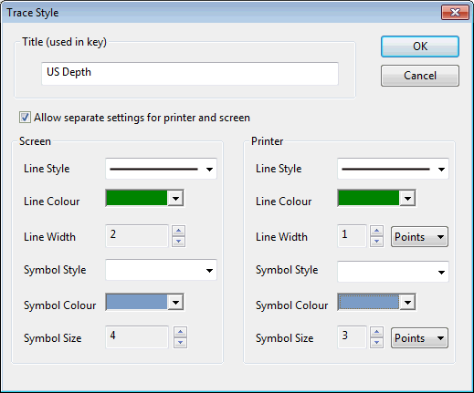You can change the title, colour, line thickness, and line symbol for a graph trace on the Trace Style dialog.