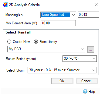 If Static analysis has been selected on the Analysis Criteria then 2D will also be ran as a static analysis. 2D will be set to use the same rainfall source as the Analysis Criteria and will use the same validation meaning it can only be used with the Modified Rational runoff method, which uses a peak rainfall intensity to produce the inflow hydrograph rather than a full hyetograph.