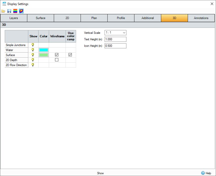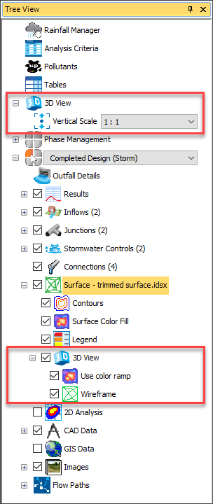 Settings specific to 3D are available under 3D sections in both the Tree View and Display Settings. There is a 3D node in the tree view underneath the surface node, which can be used to quickly update 3D surface settings.