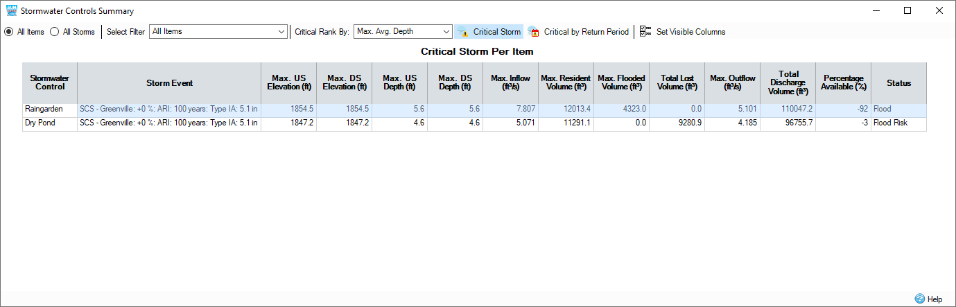 The Stormwater Controls Summary result table appears automatically after an Analysis has been run. These results indicate at a glance how oversized or how close to over-topping a Stormwater Control (SWC) may be. If the Summary is not open, select the Stormwater Controls Summary result table from the Summaries section of the Results ribbon.