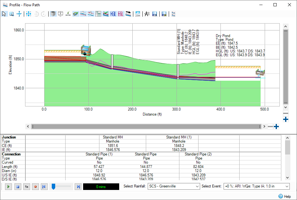 Viewing a long section Profile of the entire Treatment Train is often the easiest way to check the volume performance on a site. The Show Profile > Flow Path can be selected under the Results ribbon. The Profile animation playback is located at the bottom of the Profile view. Note that all objects shown within the Profile view can be edited by double-clicking an individual item.