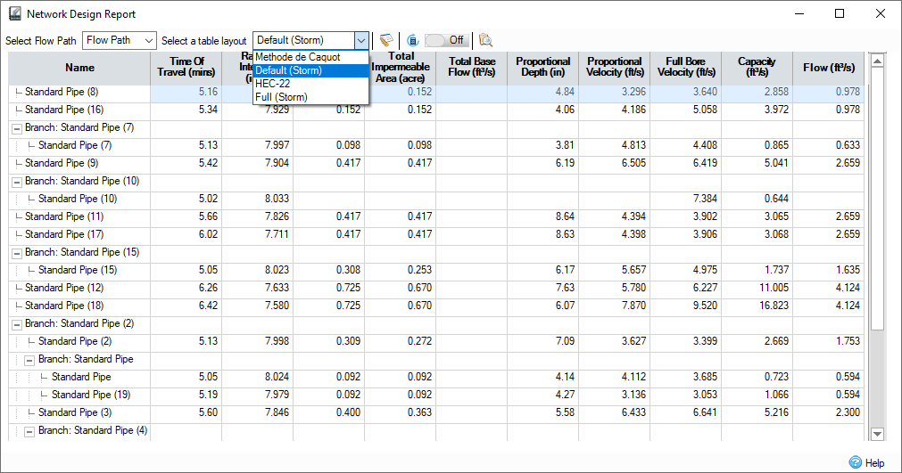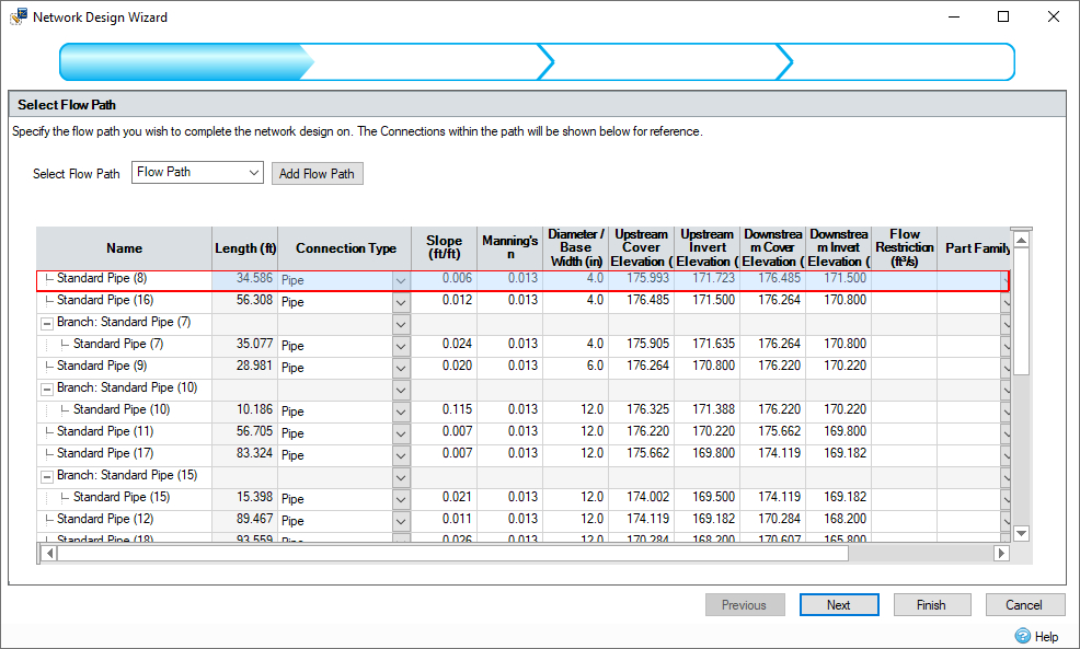 - Once the Network Design Wizard is opened, a new or existing Flow Path can be selected for sizing, including the entire Flow Path and all of its tributary branches. Since only one Flow Path has been created, simply select