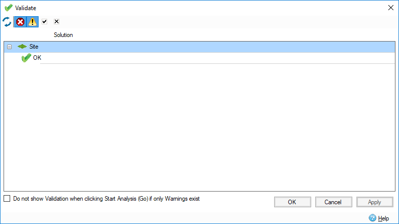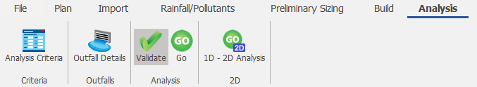 - For a system wide check for any potential discrepancies, under the Analysis ribbon select either Validate or Go – this will check the data and list any potential issues in the model.