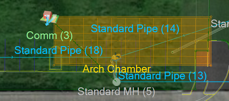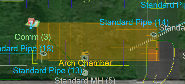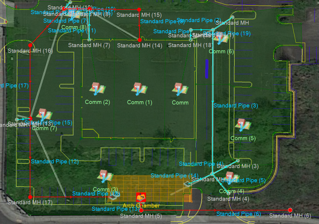 Since CAD does not represent Stormwater Controls (i.e. Ponds, Swales, Raingardens) as richly in Plan as InfoDrainage does, the Pipe Network that was imported is overly simplified and uses ‘dummy’ objects as placeholders for designers who are forced to split their work between several tools. To achieve proper Runoff Mitigation an Underground Detention Arch Chamber needs to be added, which can be easily done by converting the ‘dummy’ junction into a full Stormwater Control (SWC).