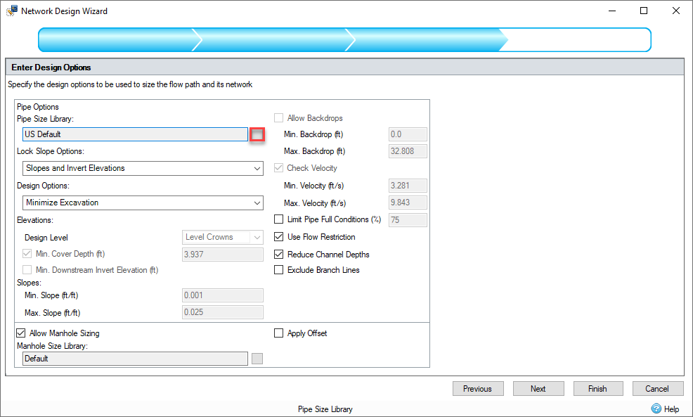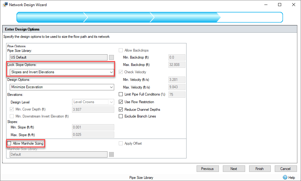 Allow Manhole Sizing, this means the manholes sizes in the template used will not be changed. Select Next on the