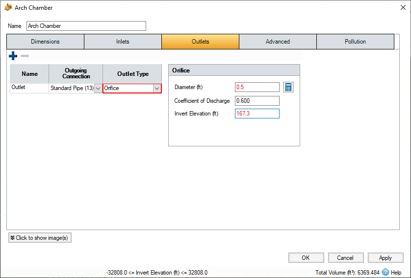 - Under the Outlets tab, from the Outlet Type drop down list, select Orifice and enter a Diameter