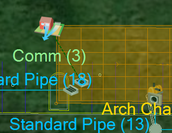 - When the Pipe Network was imported, any Junctions that fall on unconnected Inflow Areas are automatically connected to the adjacent Junction. If there are multiple Junctions imported on top of the same Inflow Area, only one will be connected, so it is important to review if all of the automatic connecting occurred as expected. In the case of Comm (3) and the Arch Chamber SWC, it appears that the Inflow Area connected automatically to the structure downstream of the Arch Chamber SWC. This can be easily updated by right-click on Comm (3) and select Reconnect Inflow. Then place the inlet next to the parking island as shown.