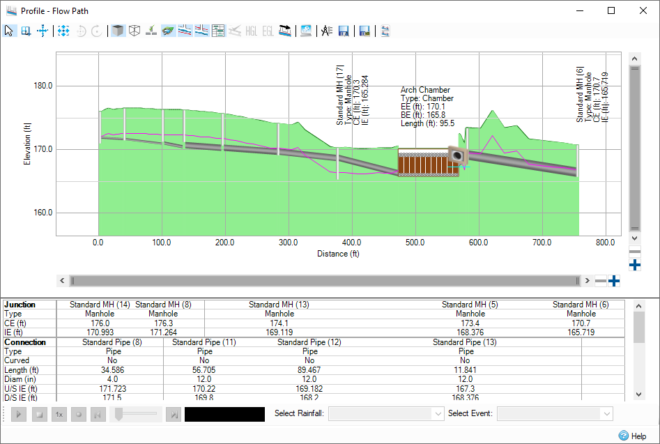 - Now that the Arch Chamber SWC has been configured, add a flow path as shown in order to view a Profile of the drainage system. Right-click