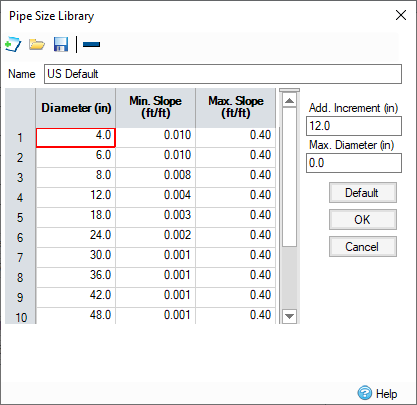 Pipe Size Library. A default Pipe Sizing Library has already been created and loaded. A list of typical pipe diameters and associated min/max design slopes will be shown. These may vary per manufacturer but these values will be used for the sake of the tutorial project.