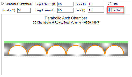 - The embedded parameters allow for the fill material above and around the chambers to be applied toward facility storage. Notice that the schematic view of the detention facility can be switched from Plan (top down) view to a Section (or an on-end profile) view.