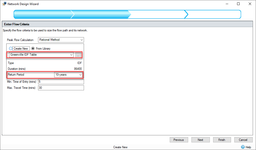 Network Design Wizard uses the Rational method for peak runoff flows based on the Preliminary Sizing input within the attached Inflow Areas, select the Greenville IDF Table as the Rainfall Source and select the 10 year return period as the event sizing for the pipe network. These Rainfall Sources can be reviewed under the Rainfall ribbon if desired. Click Next.