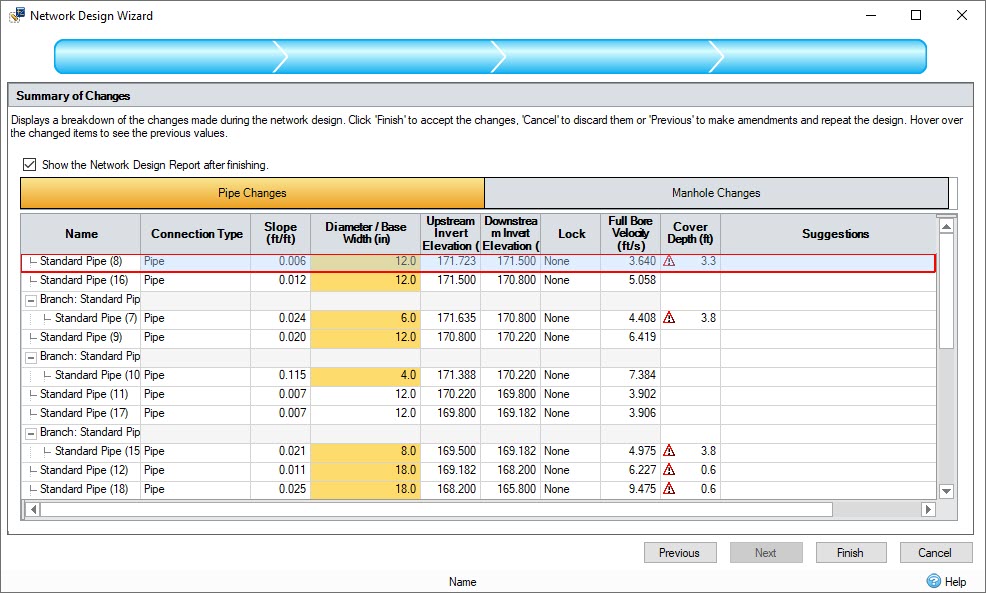 Summary of Changes table lists the changes made to the network, with cells highlighted in orange to indicate the value has changed. By hovering over a highlighted value the previous value can be seen. As the invert elevations and slopes of the pipe network were locked only Diameter changes were made to accommodate incoming flow to the system, based on the Preliminary Sizing Inflow Area parameters and the constraints chosen in the 'Flow Criteria' step of the wizard. Select