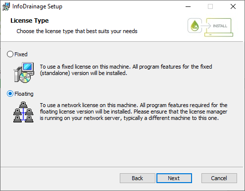 - Select the Floating option. For this installation type, all program features required for a floating licensed version will be installed. Ensure that the license manager is running on your network, typically on a different machine. Click Next. See