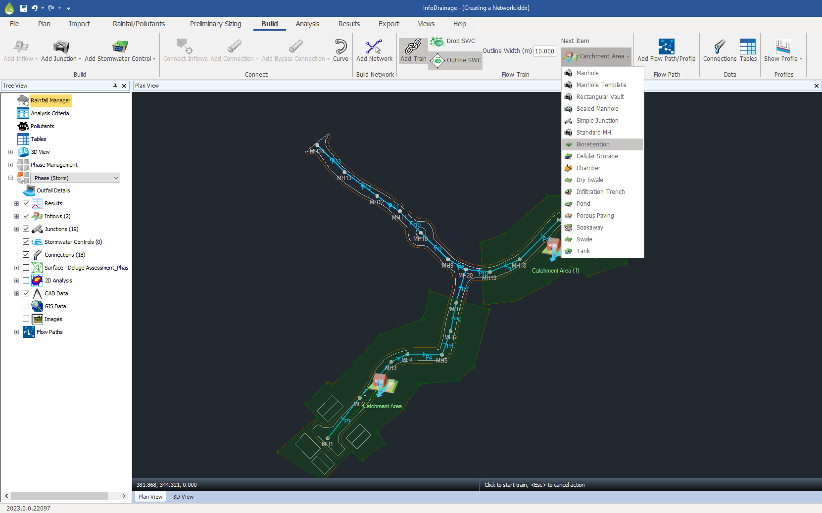 Alternatively your first click on Plan can be on an existing item. This will start the train at the existing item (regardless of the next item shown on the Build ribbon) and subsequent clicks will follow the Train sequence of adding Junctions and Stormwater controls (SWC) depending on your selection.