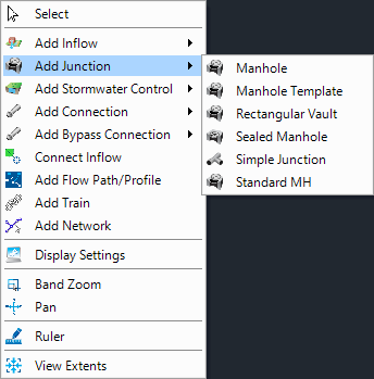 The right-click menu on Plan (below) lists the items available to be placed, this menu changes depending on the valid items that can be placed next in the sequence. You can change the Next Item using this menu, the Build ribbon or the Toolbox. Clicking Add Junction, for example, requests that the next item placed is a junction.