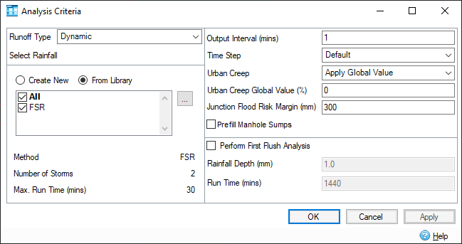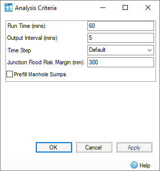 Depending whether you are running dry weather flows only, or rainfall events will depend which Analysis Criteria will be shown (Analysis Criteria - Dry Weather Flow).