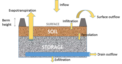 The Surface layer is used in the SWCs that have a Ponding Area: Bioretention, Pond, Swale. It is also used to represent the storage in the Tank and the Chamber. It is also used to store any flooding in SWCs that do not have a Ponding Area. The Soil layer is used only in the Bioretention. The Storage layer is used in the Bioretention, the Dry Well, the Infiltration Trench, the Porous Paving and the Swale with Trench. |