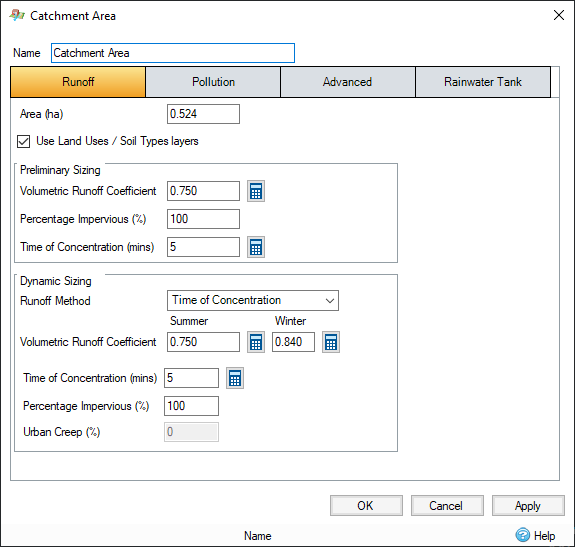 When the Use Land Uses/Soil Types layers box is unchecked, the Runoff Coefficient Calculator can be used to calculate for the Volumetric Runoff Coefficient from Land Use and Overland Slope.