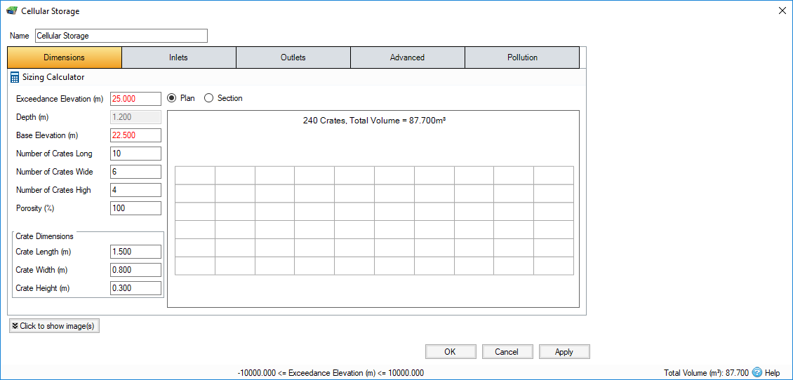 The Sizing Calculator allows you to re-size the Cellular Storage by specifying a volume and a parameter to modify to achieve that volume. The Sizing Calculator is discussed in more detail in the Stormwater Control Sizing Calculator .