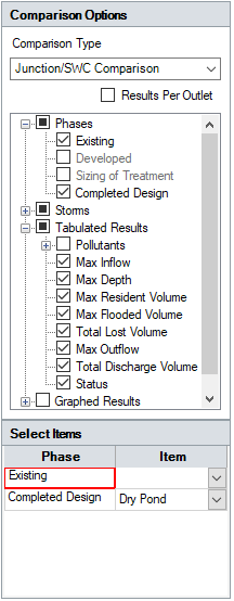 Tabulated and Graphed results will vary depending on the selected Comparison Types. Any pollutants that are present in the site will be available for selection when doing a Junction/SWC comparison. Pollutants can be selected separately for Graphing and Tabulation.