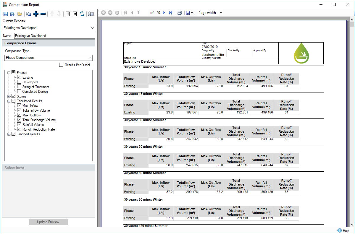 Comparison Reports can be created for any like to like comparison, e.g. a drainage system with another drainage system or a junction. Multiple reports can be created to be rendered at once. Time series analysis of the results can be done using graphs, along side detailed tabulated information with peak and total values.