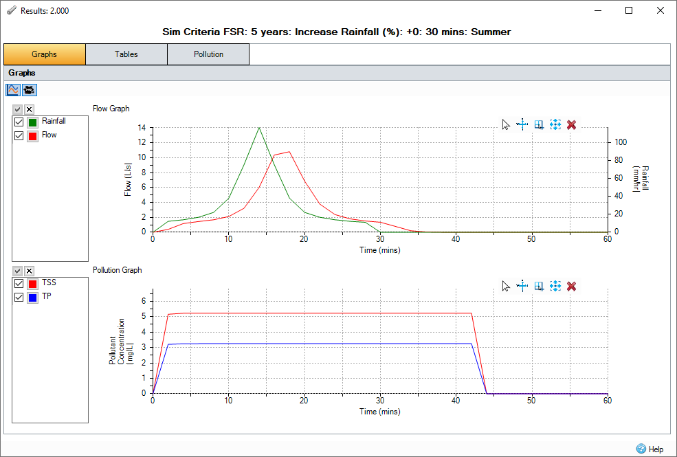 Provides graphs showing different aspects of the result, each of which can be turned on and off as required. For more information, see the Graph Tools and Results Graphs pages.