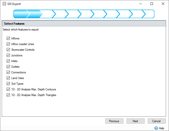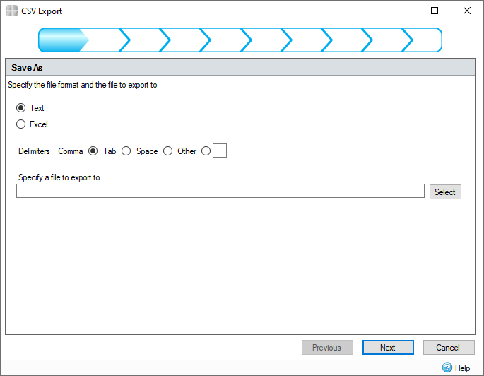 There is a wizard to guide the user through the CSV feature export process. The wizard presents the user with a sequence of dialog boxes that lead the user through a series of well-defined steps. To progress through the steps in the wizard, press the Next button. To return to a previously completed step, press the Previous button.