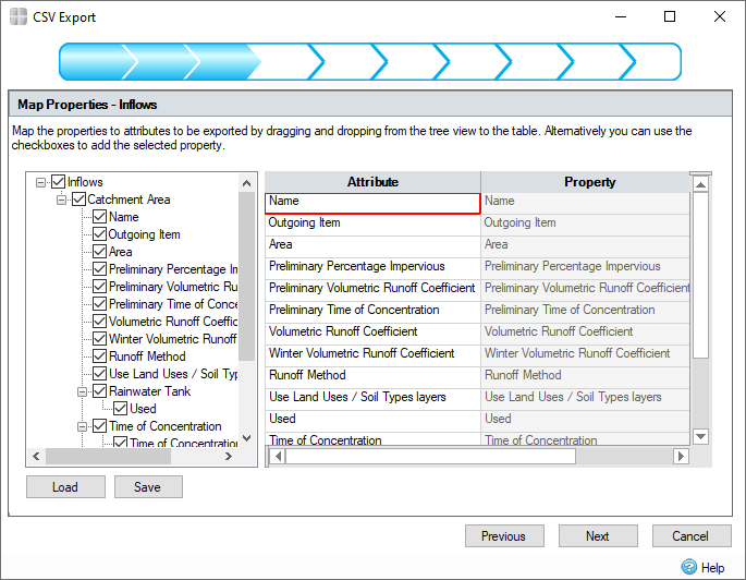 This step shows a control that allows the InfoDrainage properties to be mapped to columns in the exported files. The left hand side of the control shows a tree view of the properties in the object that will be exported. The right hand side of the control shows a table of attributes that will be written.