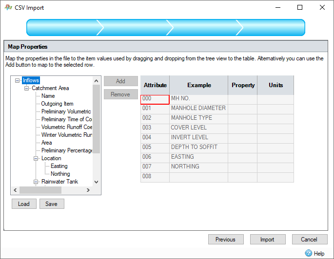 InfoDrainage will attempt to assign the attribute values read from the Text/Excel file to the available InfoDrainage property options for the imported features. If no suitable mapping is discovered for one or more of the Text/Excel attribute values, a further mapping page will be displayed that will allow an association to be made.