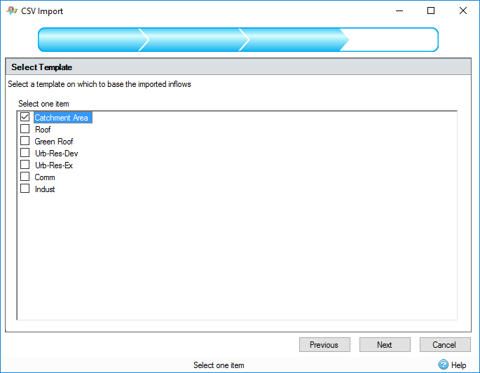 This step displays a list of templates that can be used to build objects from the imported data. These templates can be the predefined types or user created. The selected template will be used to build the objects for the imported features. Note that you will only be able to import properties that are valid for the selected template, for example if you wish to import SCS runoff method properties for a catchment area, ensure that the template chosen has SCS selected as the runoff method.