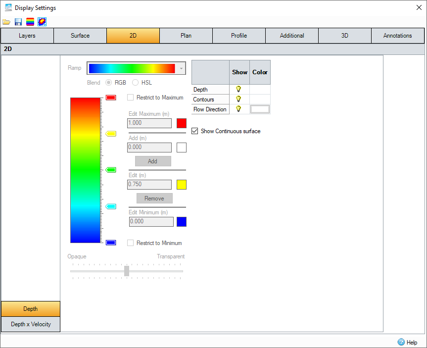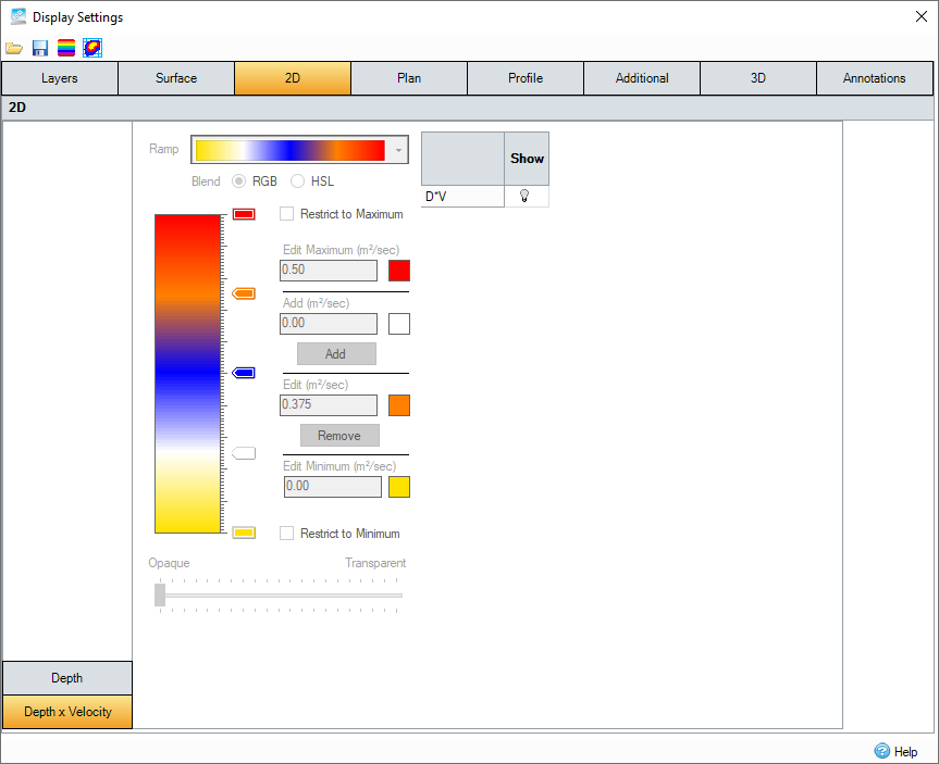 The Color Ramp dictates the colors of the Depth x Velocity that can be rendered after 2D analysis for a given set of Surface Data.