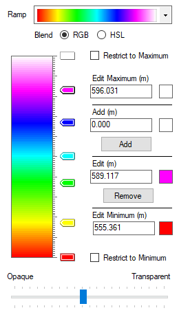 The color ramp shows the blended ramp used for Surface Elevation/Deluge rendering. If no pegs are defined, the blend is between the end peg colors. End peg values and colors can be adjusted as described below but they cannot be deleted. Moving the mouse over the ramp will display the elevation value at the mouse position. Pegs can be used to introduce a color change in the blend. See Add and Remove below for peg editing. Right-click the Ramp to display a menu also described below.