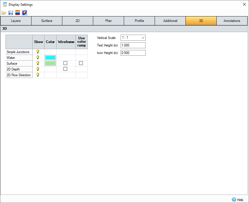 Table - Specify color, visibility, wireframe or filled, and use of color ramps, where applicable, specific to 3D.
