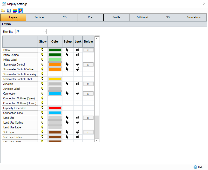 The layers can be filtered using the drop-down list above the table. This allows the table to be reduced to only show the layers required. Layers can be turned on and off by clicking the light bulb icon in their row.