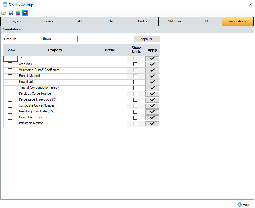 The different types can be filtered using the drop-down list above the table. This displays the annotation properties that apply only to that specific type of item, with a secondary filter then provided for the more complicated Stormwater Controls.