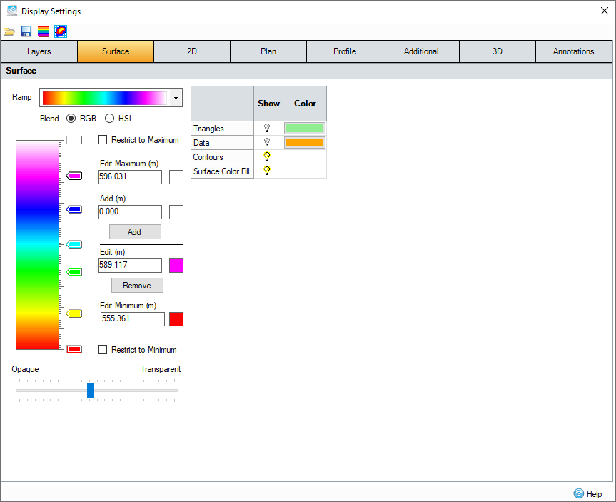 The table dictates the visibility and color of the listed layer items. The Color Ramp dictates the colors of the Contours and Color Fill that can be rendered for a given set of Surface Data.