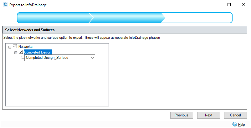 This step allows the selection of pipe networks that will be exported to InfoDrainage. Each selected network will be exported as a phase.